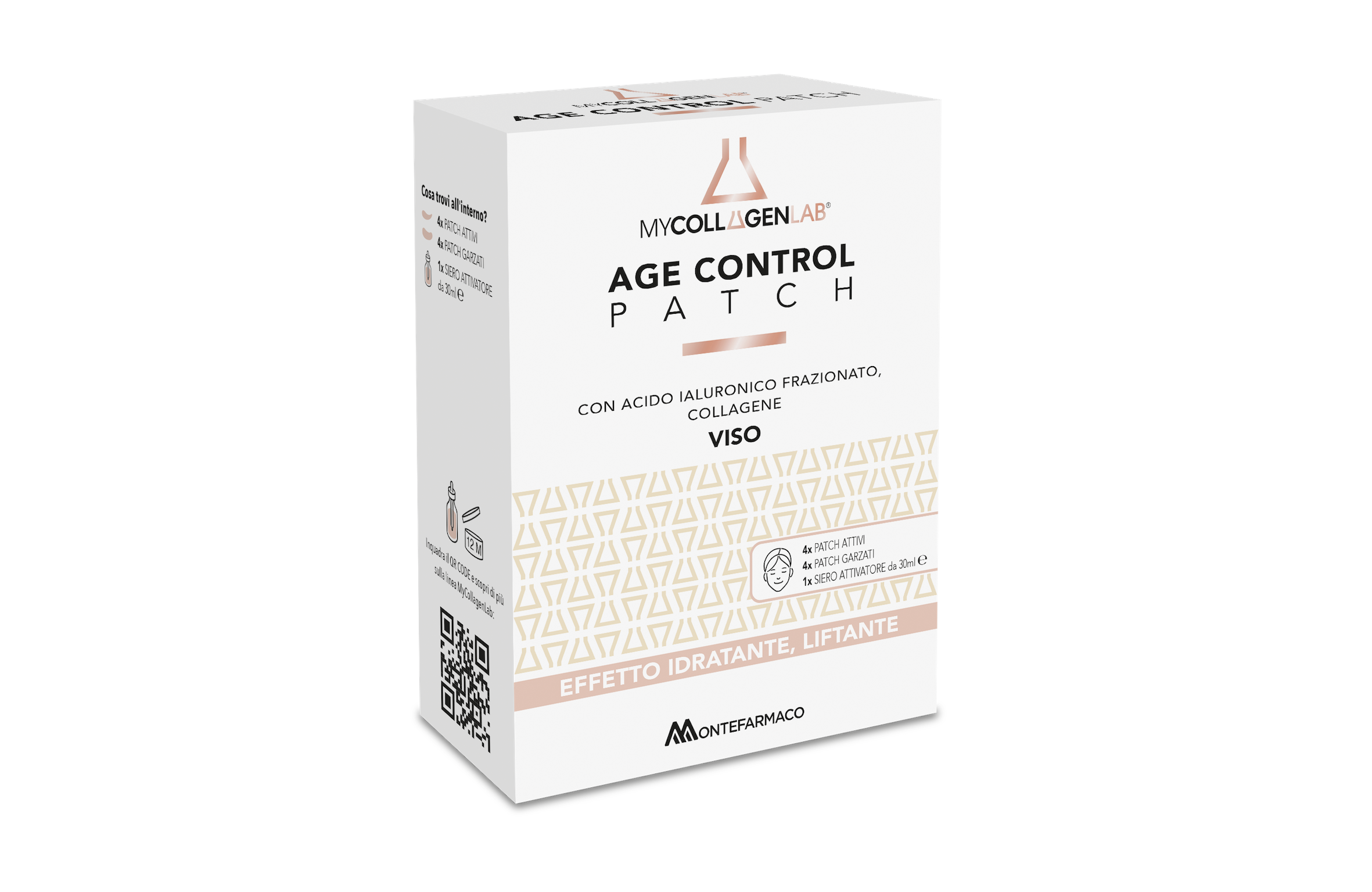 Age Control Patch è un trattamento intensivo dedicato principalmente alla zona perioculare, composto da patch attivi liofilizzati e da un siero attivatore a base acquosa studiati per un’azione mirata grazie alla combinazione di Collagene e Acido Ialuronico a diverso peso molecolare agisce in profondità e in superficie, migliorando tono, elasticità e idratazione. Il risultato è un contorno occhi più levigato, disteso e rimpolpato.